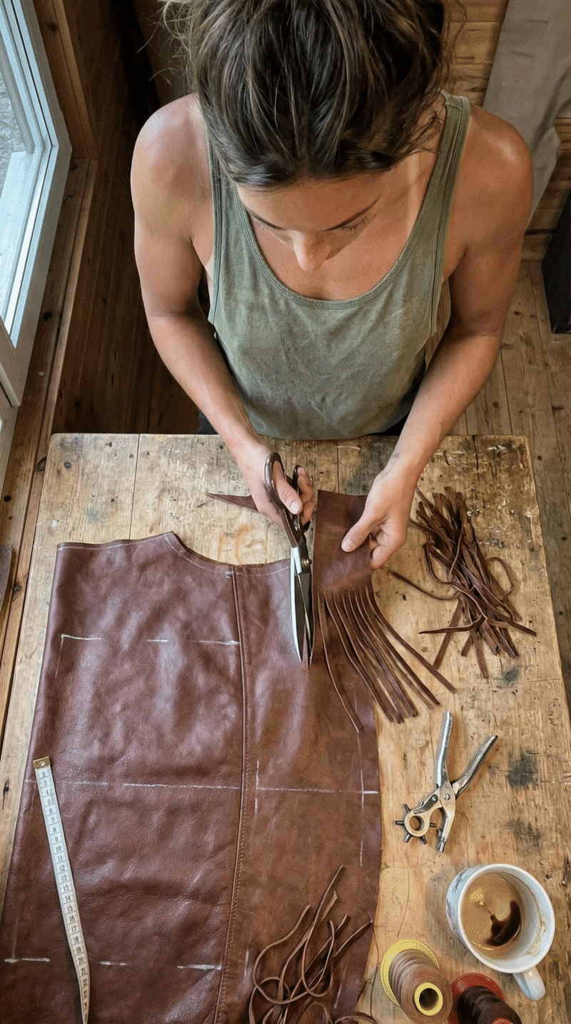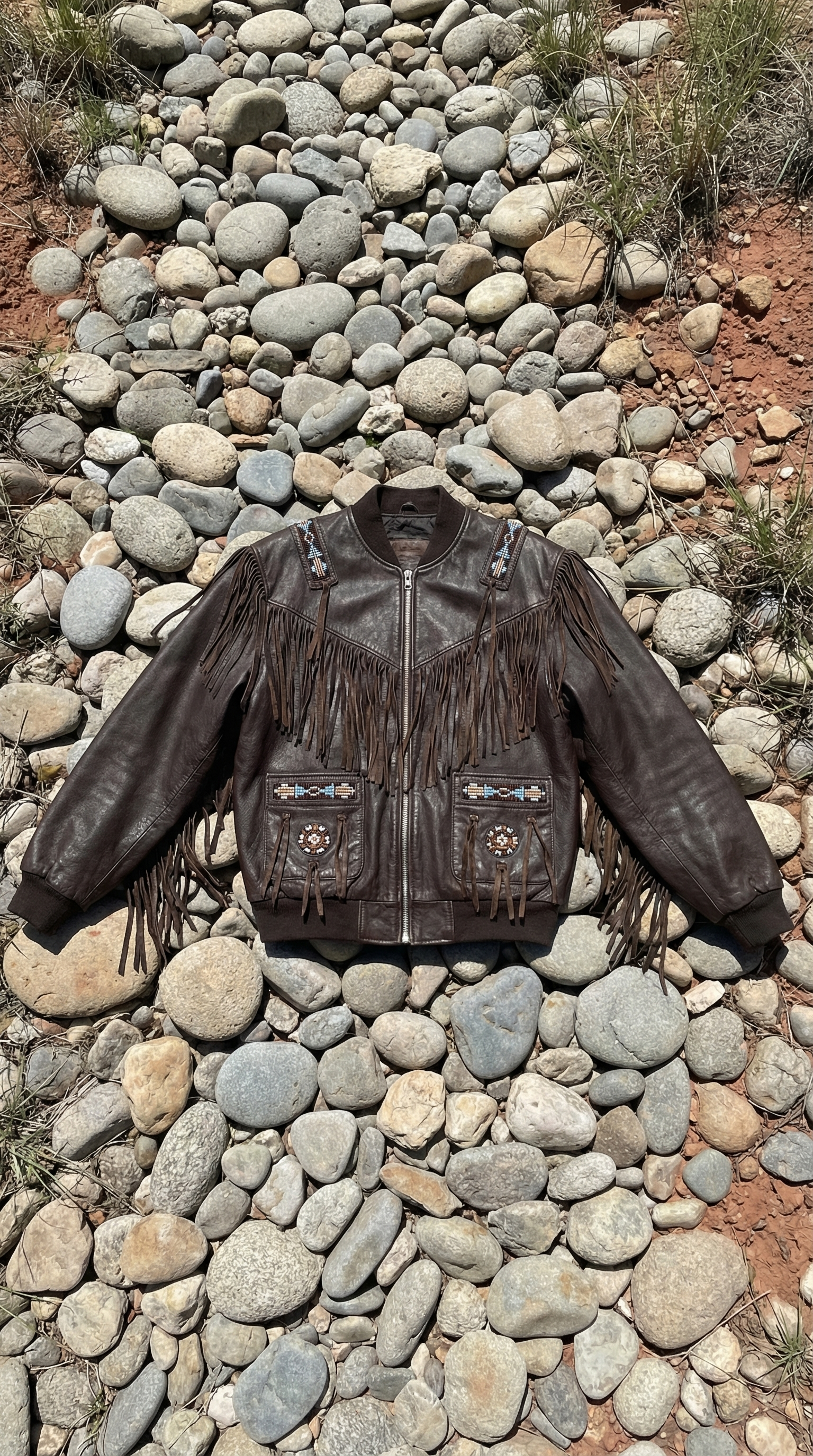 Every jacket starts as a raw hide on our workbench — we cut the fringe, set the beads, and stitch every panel ourselves before it ever ships to you🔥